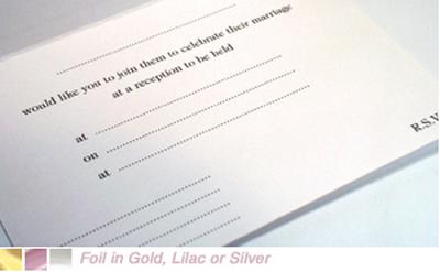Evening Invitations with white envelopes. Simple yet classic stationery for you to send to your guests, family and friends. White invitations with a choice of Silver, Lilac or Gold foil coloured borders. Pre-printed inside for you to fill out and send. Complementary white envelopes complete the look. If you like this design remember to bookmark this page. Price Calculator - Back to topYou can use the price calculator to calculate the price of items in this range. Please enter quantities in multiples of ten, starting from a minimum order of twenty for each item. Once you are happy click on 'Add to Basket'. Prices