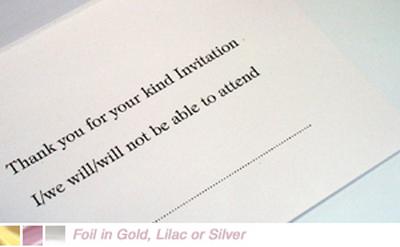 For sending out with your wedding invitations for a confirmed response from your guests. Simple yet classic stationery for you to send to your guests, family and friend. White invitations with a choice of Silver, Lilac or Gold foil coloured borders. Pre-printed inside for you to fill out and send. Complementary white envelopes complete the look. If you like this design remember to bookmark this page. Price Calculator - Back to topYou can use the price calculator to calculate the price of items in this range. Please enter quantities in multiples of ten, starting from a minimum order of twenty for each item. Once you are happy click on 'Add to Basket'. Prices