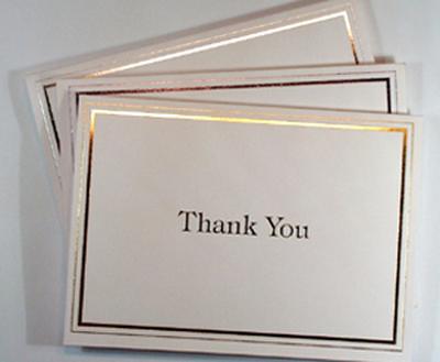Simple yet classic stationery. Thank You cards, great for sending to your guests, family and friends, to thank them for their gifts or for joining you on your special day. White cards with a choice of Silver, Lilac or Gold foil coloured borders. Blank inside for your own personal message. These cards are also suitable Thank You cards for other occasions. Complementary white envelopes complete the look. If you like this design remember to bookmark this page. Price Calculator - Back to topYou can use the price calculator to calculate the price of items in this range. Please enter quantities in multiples of ten, starting from a minimum order of twenty for each item. Once you are happy click on 'Add to Basket'. Prices