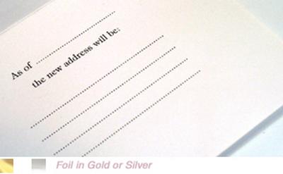 Simple yet classic stationery. Your on the move, let your friends and family know your new address. White cards with a choice of Silver or Gold foil coloured borders. Pre-printed inside for you to fill out and send. Complementary white envelops complete the look. If you like this design remember to bookmark this page. Price Calculator - Back to topYou can use the price calculator to calculate the price of items in this range. Please enter quantities in multiples of ten, starting from a minimum order of twenty for each item. Once you are happy click on 'Add to Basket'. Prices