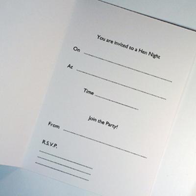 Invitations for any Hen or Stag night - just fill out your details and party! Includes white envelopes. If you like this design remember to bookmark this page. Price Calculator - Back to topYou can use the price calculator to calculate the price of items in this range. Please enter quantities in multiples of ten, starting from a minimum order of twenty for each item. Once you are happy click on 'Add to Basket'. Prices