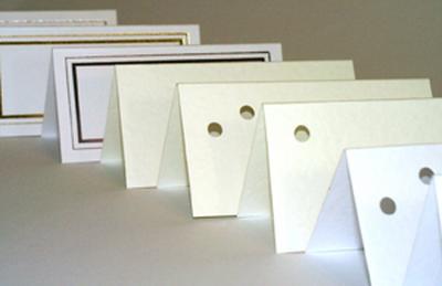 One/two/no-hole place cards, blank for you to complete. Quality place cards with a choice of textured and plain cards in Ivory or white including a choice of satin finishes or coloured foiled borders. Choose between no-holes, 1 or 2 holes to attach, thread, or stick decoration. Match these with your invitation colour scheme. (In the near future we will be able to offer a range of trims/decorations that can either be stuck onto the place cards or threaded). If you like this design remember to bookmark this page. Price Calculator - Back to topYou can use the price calculator to calculate the price of items in this range. Please enter quantities in multiples of ten, starting from a minimum order of twenty for each item. Once you are happy click on 'Add to Basket'. Prices