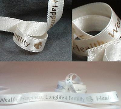 The five traditional wedding words Health, Happiness, Fertility, Long life, and Wealth are printed on a satin ribbon, Ivory with Gold foil or White with Silver foil. Use to decorate your wedding accessories such as cameras, sachet bags or favour boxes. The price code units in this case refer to meters, for example '20' is not 20 units but '20 meters' of ribbon. If you like this design remember to bookmark this page. Price Calculator - Back to topYou can use the price calculator to calculate the price of items in this range. Please enter quantities in multiples of ten, starting from a minimum order of twenty for each item. Once you are happy click on 'Add to Basket'. Prices